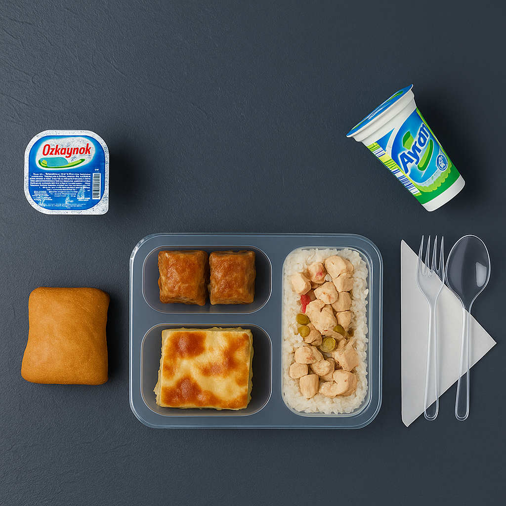 Pirinç pilavı, tavuk kavurma, su böreği ve ayran ile hazırladığımız menümüz.